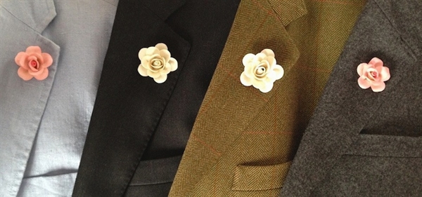 In 2013, after much research, design and dedication, we finally completed our collection of finely crafted porcelain Boutonnieres. Handmade in Italy by a family business of artisans, using Capidomonte porcelain, this fine yet surprisingly strong material allows for intricate detailing of each individual petal. Each flower is then mated to a unique clasp, made [ed. in Sheffield] to our registered design, the shape of which not only ensures a sound grip on the suit without piercing (and therefore potentially damaging the fabric), but also remains hidden beneath the flower itself when in situ and affords ample space for the owner to add personalised engraving on the reverse of the clasp.